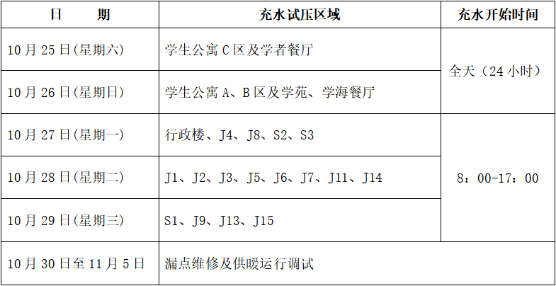 为做好今年冬季供暖工作,根据《青岛市城市供热条例》规定和学校供暖工作进度安排,学校定于10月25日(星期六)起对教学区供暖系统充水试压,请广大师生提前做好暖气试压检查工作。
