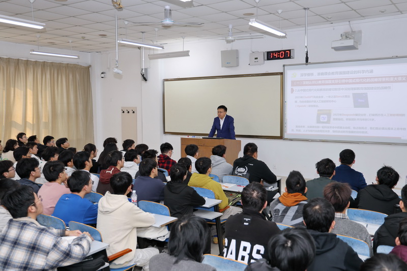 授课中,王君松以丰富的案例与大量的数据,从三个维度对教育强国建设进行了系统阐释,为青年学子厘清认知、指明方向。在“深学细悟,准确领会教育强国建设的科学内涵”部分,他强调,认识教育强国建设的战略意义,需置于世界现代化发展历程、中国式现代化与教育的紧密关联,以及当前教育发展的基础与挑战中综合考量。他明确,建成教育强国需具备强大的思政引领力、人才竞争力等“六大能力”,并详细解读了落实立德树人根本任务、强化教育对科技人才的支撑作用等关键实践路径。