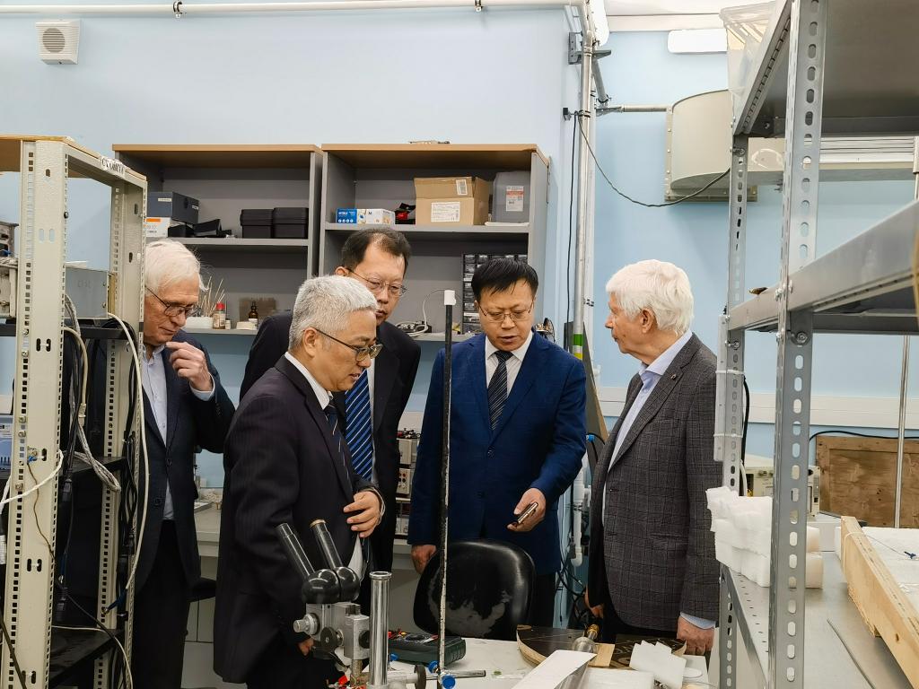 访问列别捷夫物理研究所期间,代表团与副所长萨维诺夫·谢尔盖进行会谈,讨论了共建海洋数学物理联合创新平台相关事宜,在俄罗斯科学院院士普达洛夫·弗拉基米尔·莫伊谢耶维奇陪同下考察了高温超导与量子材料中心、巴索夫量子无线电物理学分部,会见了与我校建立长期合作关系的俄罗斯科学院院士库兹涅佐夫·叶夫根尼,了解双方合作进展情况,并请其推荐数学物理领域优秀人才来校交流合作。