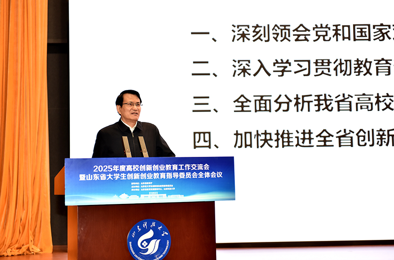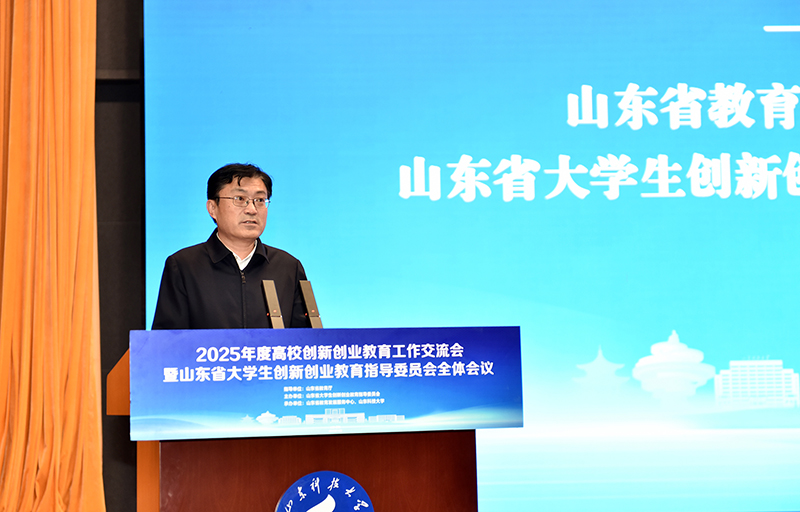 12月19日,2025年度高校创新创业教育工作交流会暨山东省大学生创新创业教育指导委员会全体会议在山东科技大学召开。省委教育工委委员、省教育厅党组成员、副厅长王浩,山东科技大学党委书记王君松,党委常委、副校长诸葛福民出席会议。省教育厅高等教育处处长曾宪文总结部署全省高校创新创业教育工作。会议由省教育发展服务中心主任魏光祥主持。