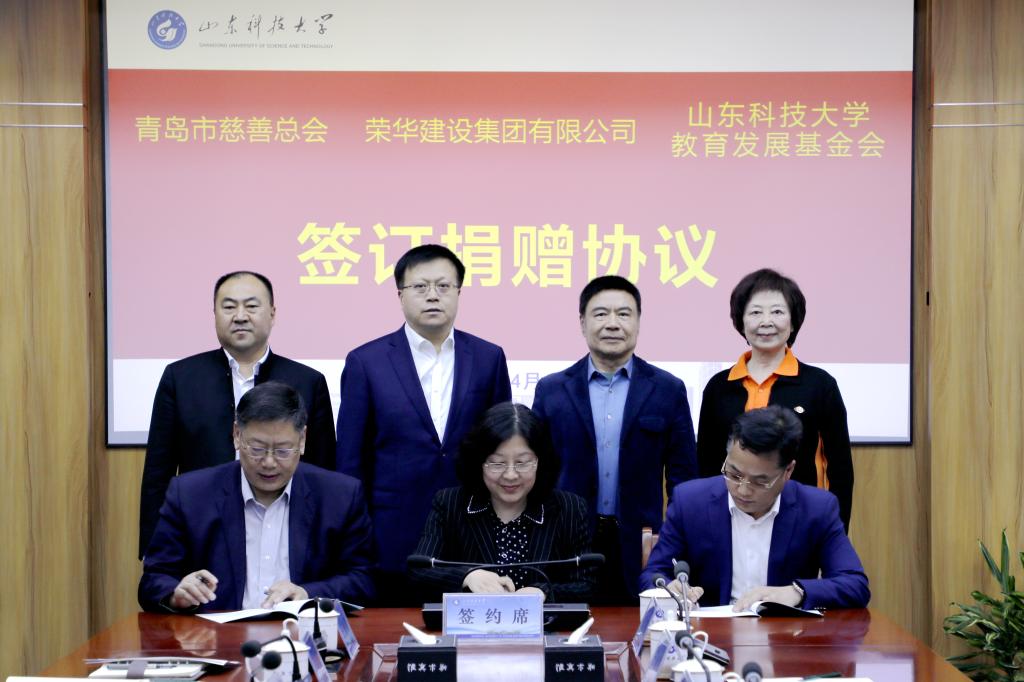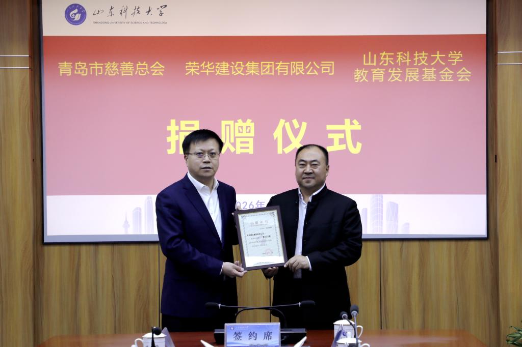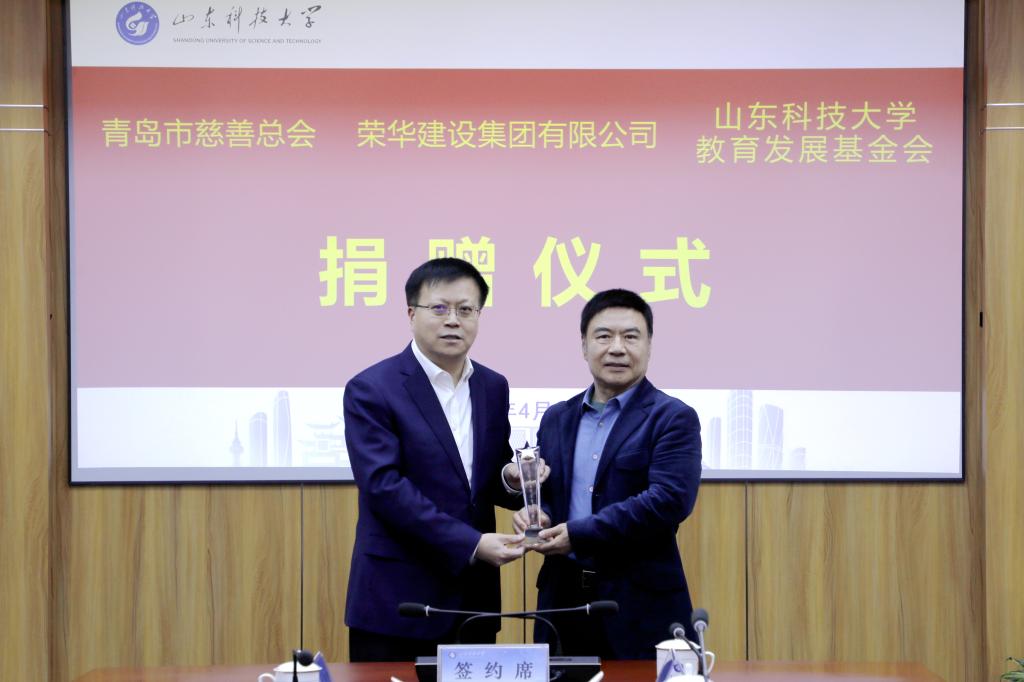 4月1日,“荣华教育基金”捐赠仪式在我校举行。校党委书记王君松出席仪式并致辞,青岛市慈善总会会长王伟、山东大学青岛校友会会长肖黎、荣华建设集团董事长孙涌出席仪式。仪式上,校党委常委、副校长诸葛福民,青岛市民政局党组成员、市慈善总会专职副秘书长盛梅,荣华建设集团副总裁于永刚分别代表校企会三方签订捐赠协议书。于永刚、诸葛福民分别代表捐赠与受赠双方交接捐赠支票。王君松向王伟、孙涌颁发山东科技大学教育贡献奖杯和证书。