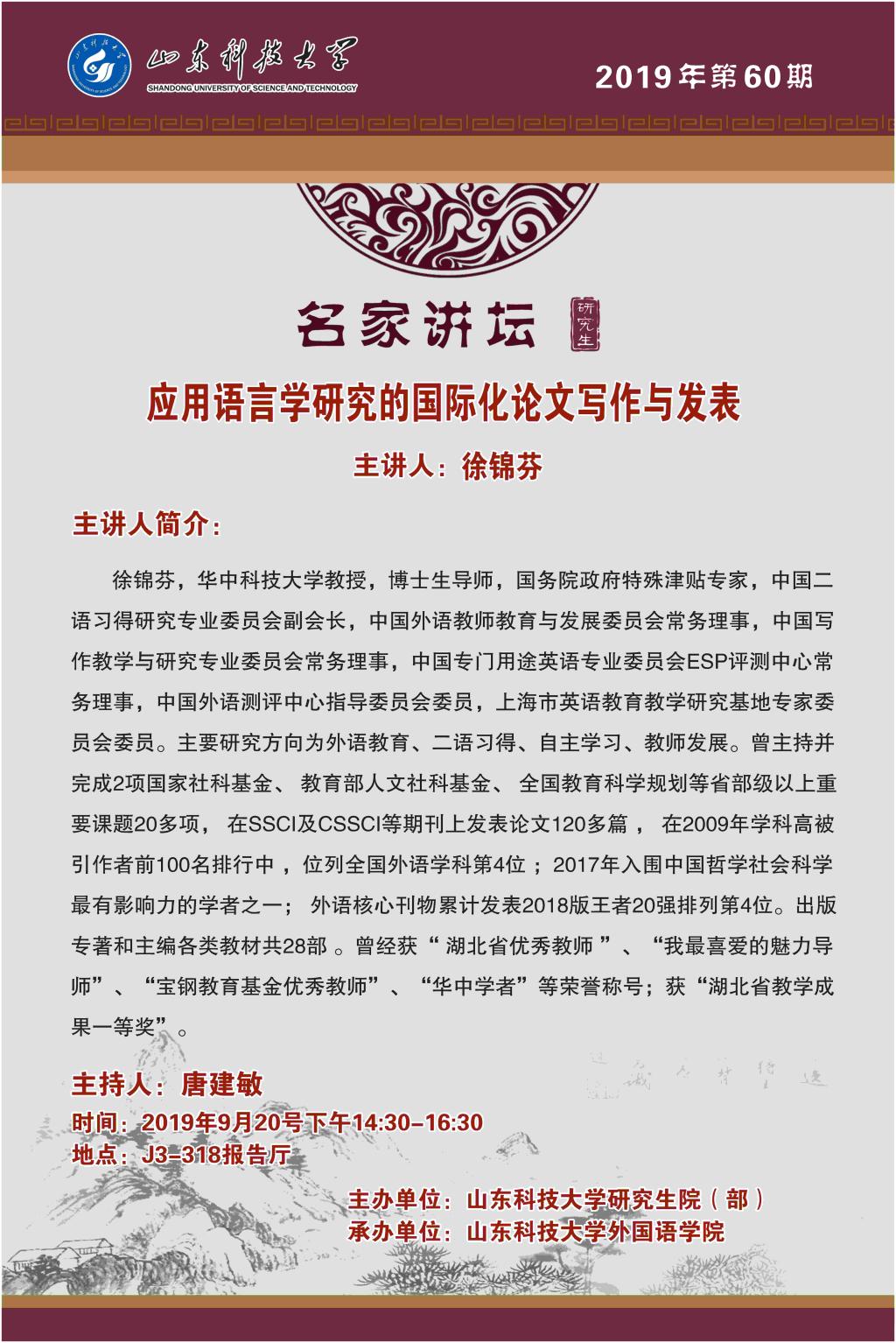 “名家讲坛”2019年第60期:应用语言学研究的国家化论文写作与发表